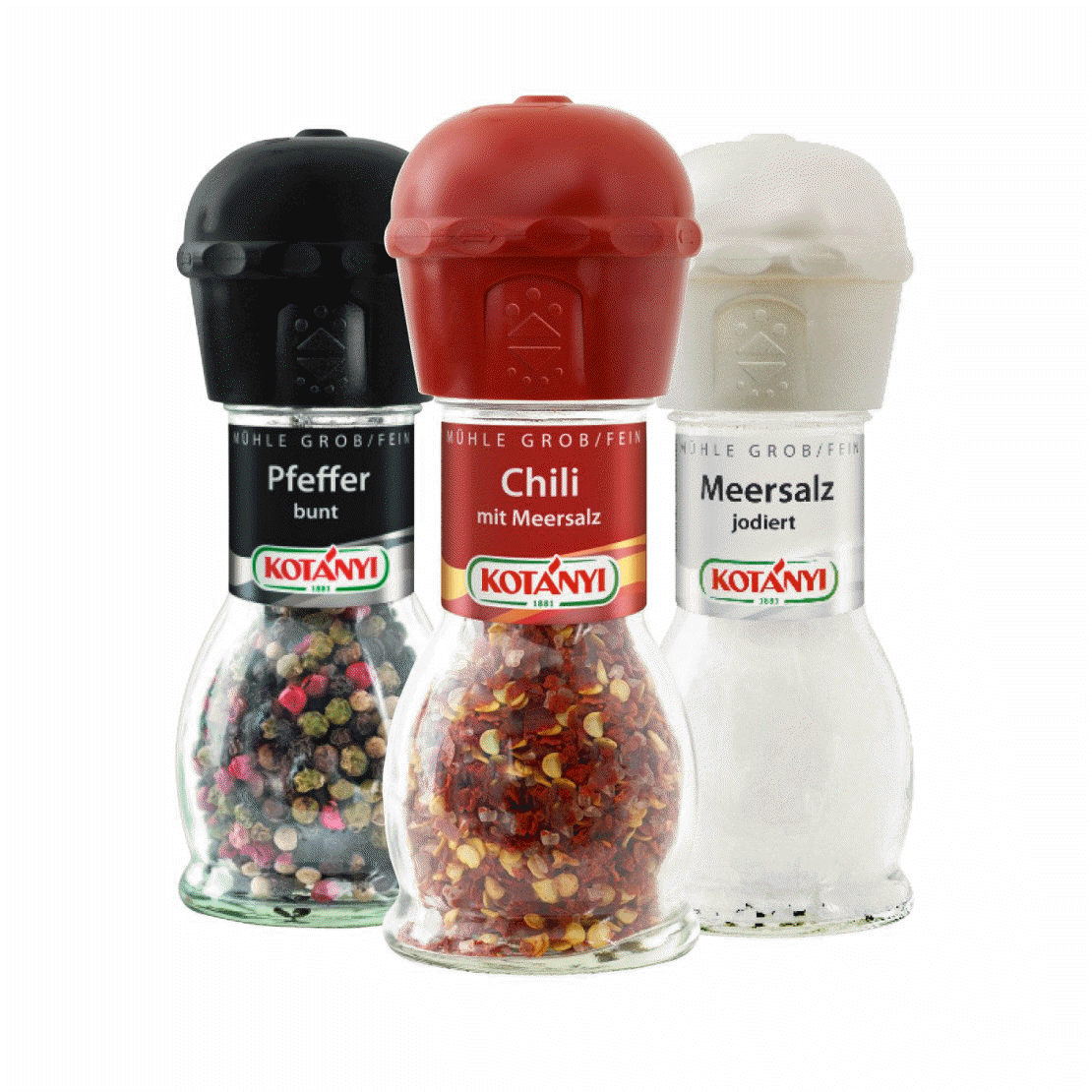 Mit ihrer hochwertigen Gewürzmühlen-Range bringt Kotányi frische Aromen und fein abgestimmte Würze direkt auf den Teller – individuell dosierbar, stets frisch gemahlen und in bewährter Premiumqualität. Ob klassisch, exotisch oder kreativ: Die große Bandbreite der Kotányi Mühlen lässt keine Wünsche offen und begeistert sowohl Hobbyköche als auch Profis.