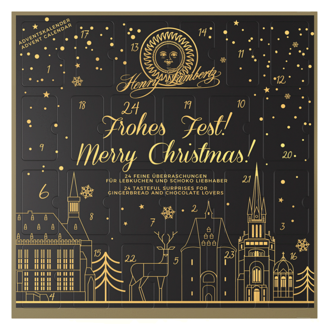 Adventskalender sind untrennbar verbunden mit der Weihnachtskultur. Sie überbrücken die Wartezeit bis Weihnachten und erfreuen sich großer Beliebtheit bei Alt und Jung. Der Henry Lambertz Adventskalender ist eine Innovation, denn es ist der erste Kalender, der mit Lebkuchen gefüllt ist. Er überrascht täglich mit anderen Klassikern wie Elisen-Lebkuchen, Saft-Printen mit Mandeln und Nüssen, Honig- Lebkuchen, Dominosteinen und mit der Pralinen-Spezialität Mozartkugeln in Vollmilch und Zartbitter-Schokolade. Im eleganten, schwarz-goldenen Design ist der Henry Lambertz Adventskalender auch optisch ein Hingucker und eignet sich hervorragend als Geschenk. Die gesamten Spezialitäten des Kalenders sind ohne Alkohol und können von Erwachsenen sowie Kindern unbedenklich genossen werden.