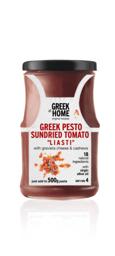 In the authentic Greek way, we blend together tomatoes with graviera cheese and cashews. The sweet and satisfying taste of our Sun-Dried Tomato Pesto is perfectly paired with your pasta. Just mix the sauce into your pasta and enjoy!