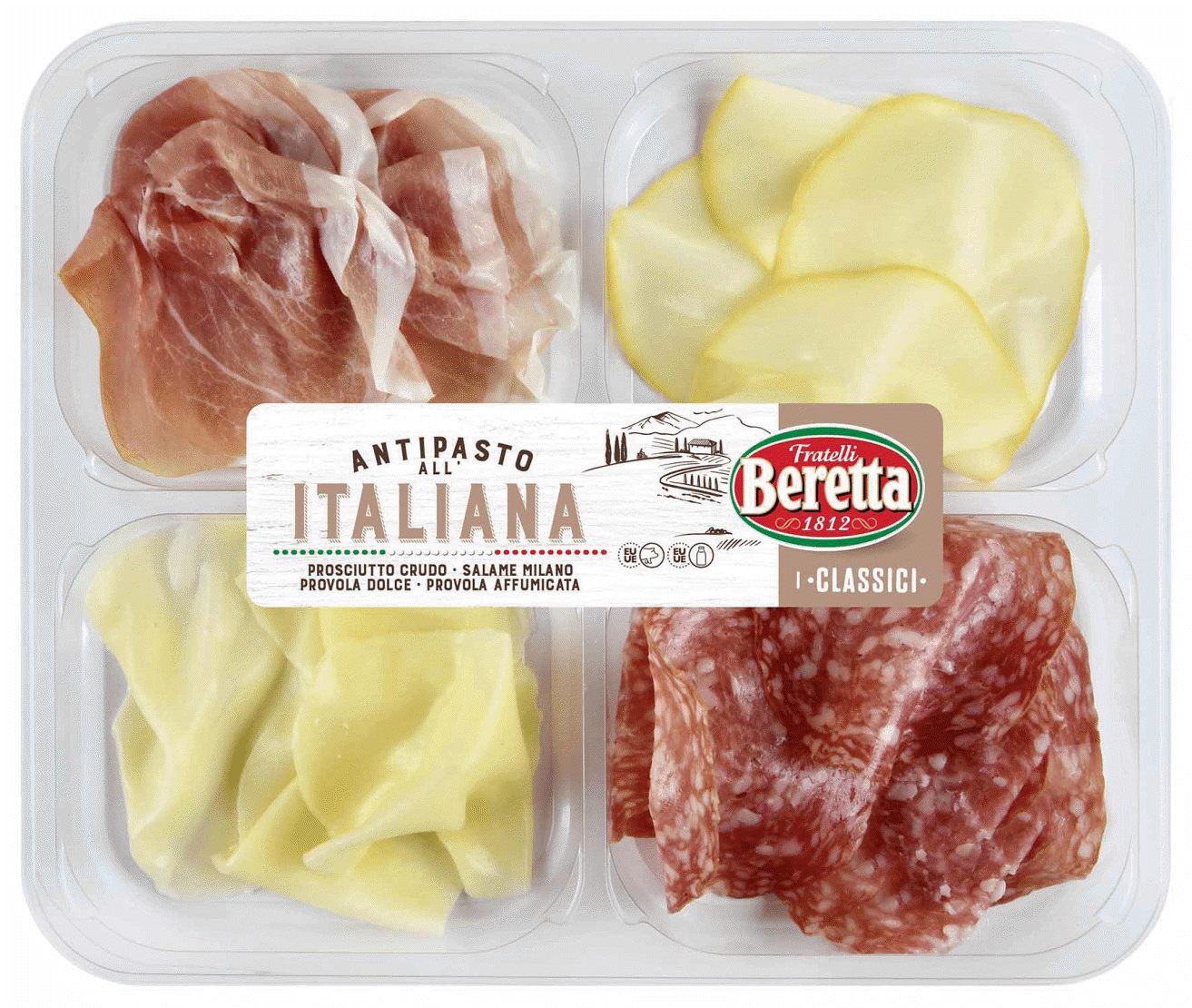 Die Beretta Antipasto-Platte im italienischen Stil (140g) ist eine Mischung aus außergewöhnlichen Aufschnittwaren und Käsesorten für einen authentischen italienischen Aperitif oder Appetitanreger. Das Antipasto besteht aus: Prosciutto crudo, Salame Milano, süßem und geräuchertem Provola, alles dünn geschnitten und in separaten Fächern angeordnet, um das Aroma jedes einzelnen Bestandteils bestmöglich zu erhalten. Das Produkt bietet den Verbrauchern die Bequemlichkeit einer vorab ausgewählten Mischung sowie die Praktikabilität eines Serviertabletts, das am Tisch geteilt werden kann. Antipasto all’Italiana ist Teil des breiten Angebots von Beretta-Platten, die in 3 Linien angeboten werden: 'Die Klassiker' mit traditionellen Kombinationen, 'Die Auswahlen' mit nur ausgewählten Aufschnittwaren und 'Die Köstlichen' mit komplexen Mischungen, die durch Zutaten oder Geschmacksprofile gekennzeichnet sind.