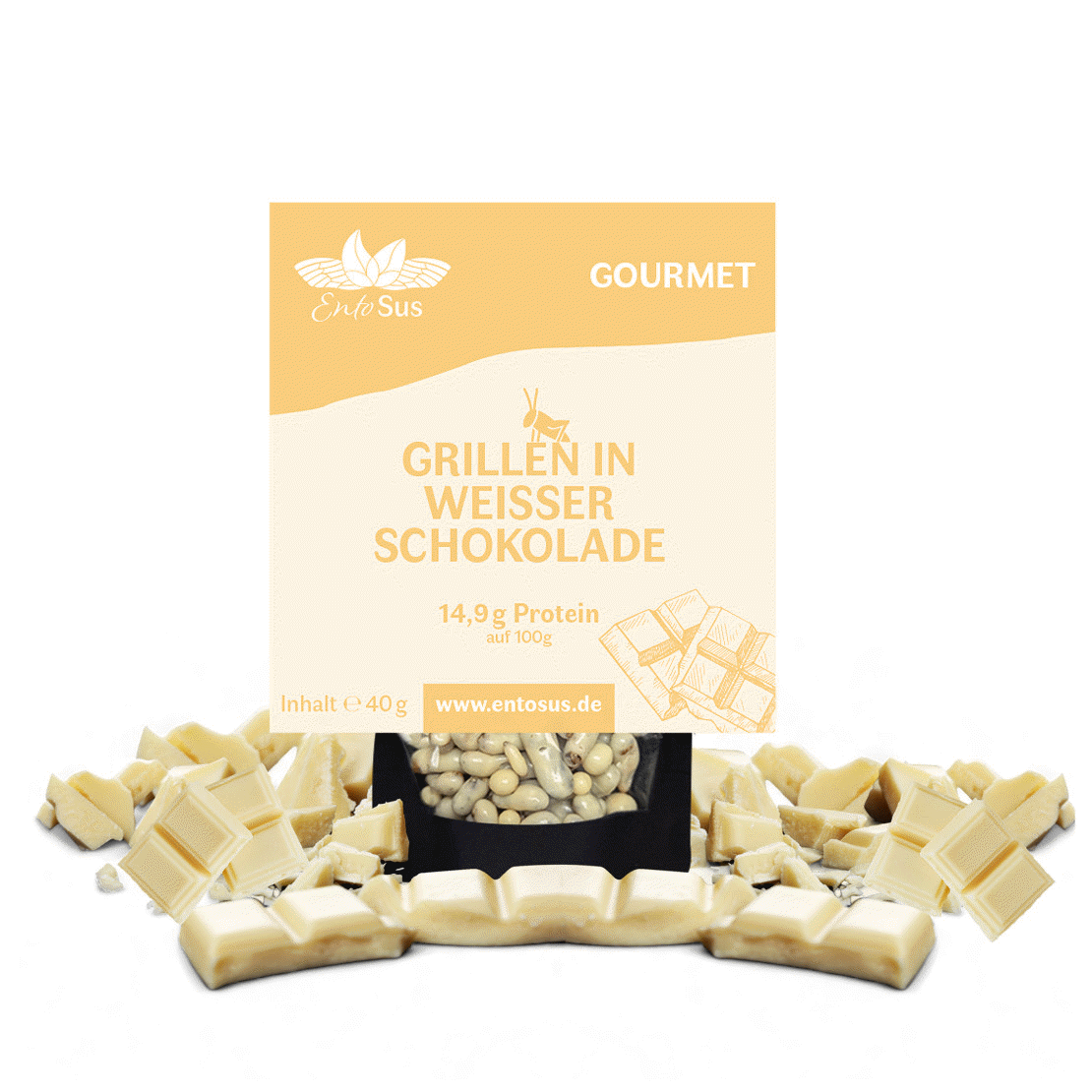 Jeder knusprige Biss enthüllt eine harmonische Verschmelzung von 84% weißer belgischer Schokolade und sorgfältig ausgewählten Grillen.