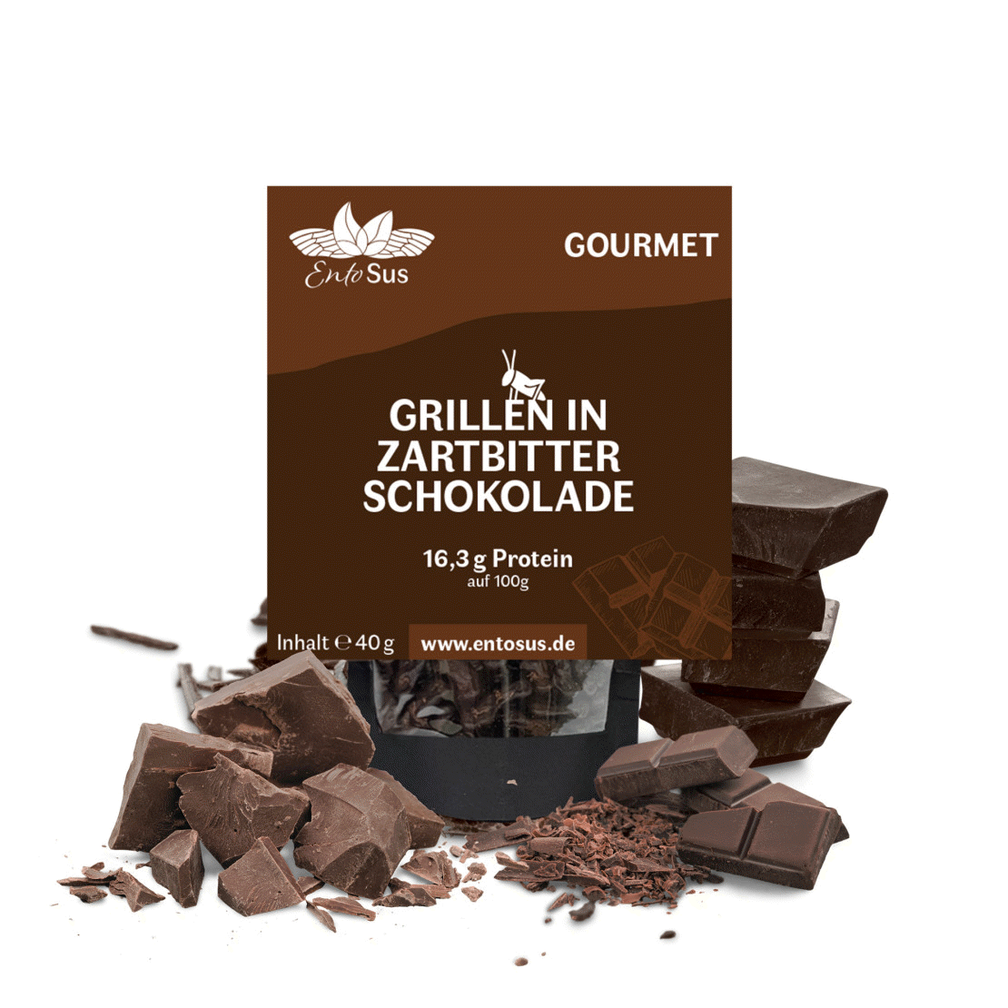 Die tiefen, reichen Aromen der Zartbitterschokolade treffen auf den unverwechselbaren Geschmack der Grillen und ergeben eine perfekte Balance zwischen süß und bitter. Jeder knusprige Biss enthüllt ein Zusammenspiel von Texturen und Aromen, das deine Sinne belebt und deinen Gaumen verwöhnt.