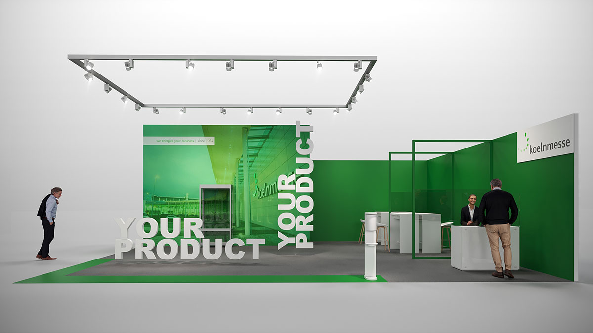 Die Preisangaben beziehen sich immer auf einen B8 x T7 = 56m² Eckstand. Andere Standgrößen und Standformen (Reihenstand, Kopfstand, Blockstand) sind modular adaptierbar und kalkulieren wir nach Ihrem Briefing gerne individuell für Sie.