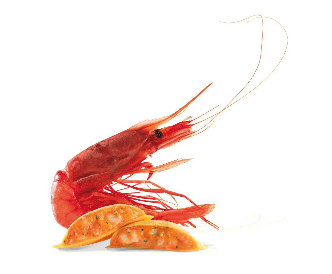 Der erlesene Geschmack der Premium-Rotgarnelen entfaltet sich vollends in der Bisque, die sie umhüllt und eine intensive Umami-Note freisetzt. Diese wird mit großer Sorgfalt zubereitet, um eine cremige und zugleich feine Textur zu erreichen, die sich perfekt mit dem Pastateig verbindet – dabei bleibt die Zartheit erhalten und der charakteristische, vollmundige Geschmack kommt ideal zur Geltung. Leichte, schlichte Saucen sind die perfekte Begleitung für diese Füllung, da sie ihre Feinheit unterstreichen, ohne sie zu überdecken.